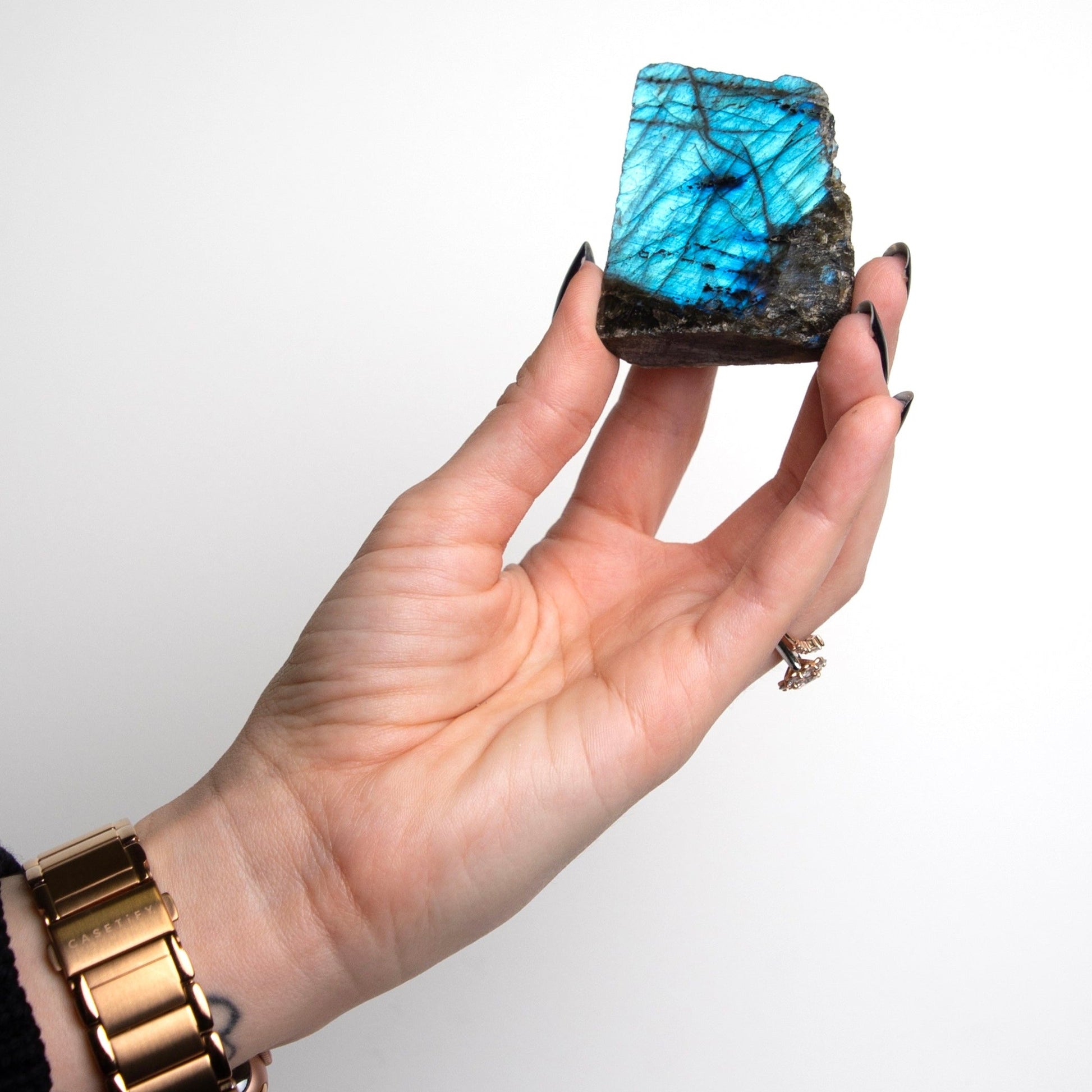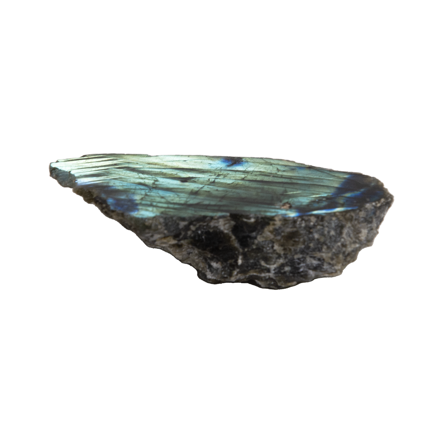Bring a Labradorite Half-Polished Chunk into your home for decorative and energetic purposes. As a stone of limitless potential, Labradorite illuminates the possibilities that surround you. The visual appearance of a Labradorite crystal reflects its energy. With flashes of neon light hidden by bluish gray hues, Labradorite surprises the viewer with its unexpected shine.
